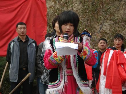 潔白的哈達,紅艷艷的羌紅,在明麗的陽光下飄揚出優美的弧線,穿著節日盛裝的藏族、羌族村民們,構成一片姹紫嫣紅的美麗圖畫,濃郁的少數民族鼓樂響起來,嗩吶手鼓足了勁,腮幫子鼓得很高,高亢的樂音升騰開去,被父母精心打扮的藏、羌少數民族孩子歡快奔跑,氣氛一片歡騰。