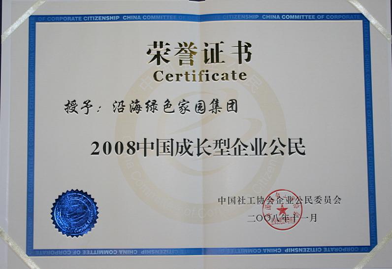 11月16日,由中國社工協會企業公民委員會主辦的第四屆中國優秀企業公民表彰大會,在北京人民大會堂隆重舉行。沿海集團因其良好的企業經營業績、高度的社會責任感以及在母親水窖、抗震救災中的突出表現,被授予“2008中國成長型企業公民”稱號。這是繼6月底沿海集團獲得中國地產金磚獎之最高獎項------“中國地產企業公民大獎”后,又一次在企業公民領域得到權威的認可。