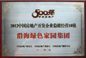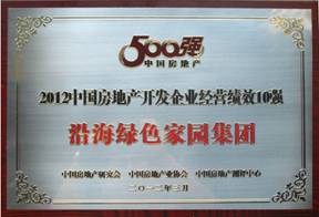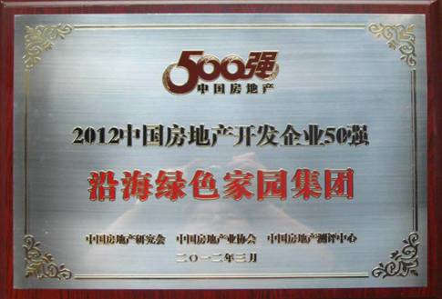 2012年3月21日,由中國(guó)房地產(chǎn)研究會(huì)、中國(guó)房地產(chǎn)業(yè)協(xié)會(huì)、中國(guó)房地產(chǎn)測(cè)評(píng)中心三家單位聯(lián)合主辦的 "2012中國(guó)房地產(chǎn)開(kāi)發(fā)企業(yè)500強(qiáng)" 測(cè)評(píng)活動(dòng)在北京國(guó)貿(mào)三期舉行測(cè)評(píng)成果發(fā)布會(huì)。《2012中國(guó)房地產(chǎn)開(kāi)發(fā)企業(yè)500強(qiáng)測(cè)評(píng)研究報(bào)告》顯示:沿海綠色家園集團(tuán)入選2012年中國(guó)房地產(chǎn)開(kāi)發(fā)企業(yè)50強(qiáng),全國(guó)排名排名第45位,并榮獲 "中國(guó)房地產(chǎn)開(kāi)發(fā)企業(yè)穩(wěn)健經(jīng)營(yíng)10強(qiáng)" 和 "中國(guó)房地產(chǎn)開(kāi)發(fā)企業(yè)經(jīng)營(yíng)績(jī)效10強(qiáng)" 兩個(gè)單項(xiàng)榮譽(yù)。