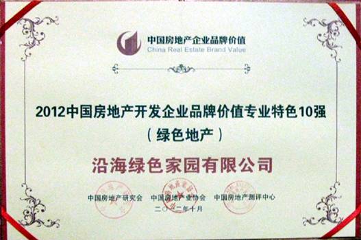 2012年10月16日,由中國(guó)房地產(chǎn)研究會(huì)、中國(guó)房地產(chǎn)業(yè)協(xié)會(huì)、中國(guó)房地產(chǎn)測(cè)評(píng)中心聯(lián)合主辦的“2012中國(guó)房地產(chǎn)品牌價(jià)值測(cè)評(píng)成果發(fā)布會(huì)”在北京召開(kāi),沿海集團(tuán)再次榮獲健康綠色地產(chǎn)榮譽(yù):“2012中國(guó)房地產(chǎn)開(kāi)發(fā)企業(yè)品牌價(jià)值專(zhuān)業(yè)特色10強(qiáng)—綠色地產(chǎn)”