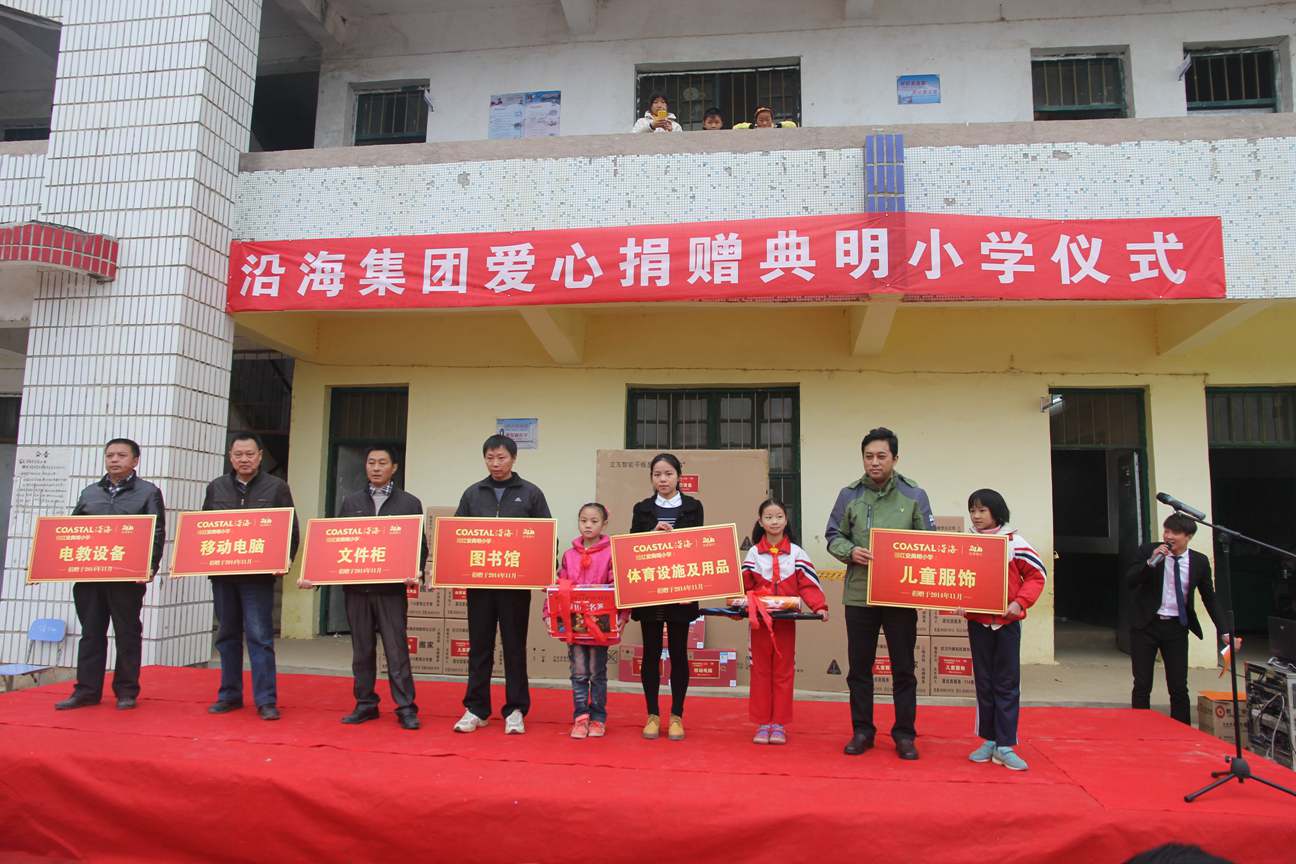 1115日上午,在大別山下中國第一將軍縣-----紅安縣的典明小學操場上,北風的微寒被一場充滿溫暖的捐贈儀式驅走了。來自沿海綠色家園集團和近二十家全國知名媒體代表組成的沿海善行愛心代表團,帶著沿海綠色家園集團捐贈的一批價值十多萬元的電教設備、移動電腦、班級圖書館、體育設施和器材、文件柜,以及沿海綠色家園集團的員工、沿海社區的業主和客戶捐贈的1000多冊課外讀物、近2000件學習用具、100多件體育用品和2000多件衣服來到這里,送到典明小學的師生代表手上,為正在改造建設中的學校錦上添花,為學生們送上歡欣和溫暖。