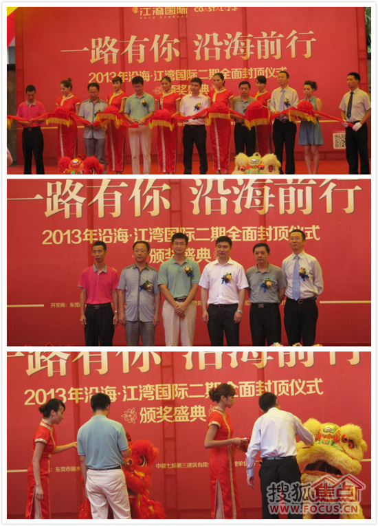 為了慶祝封頂儀式,活動現(xiàn)場穿插了“鑼鼓喧天”、醒獅“點睛”等重要環(huán)節(jié),沿海地產(chǎn)還為先進(jìn)建設(shè)單位和個人頒發(fā)了榮譽獎?wù)隆?
