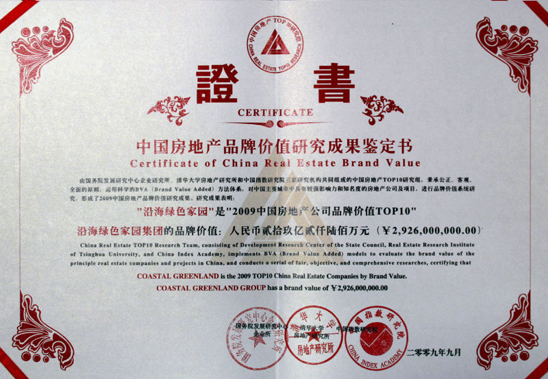 沿海集團(tuán)以持之以恒的品牌建設(shè)和責(zé)任領(lǐng)跑的持續(xù)創(chuàng)新,榮獲2009年度中國(guó)房地產(chǎn)品牌價(jià)值TOP10。這是沿海集團(tuán)連續(xù)六年獲此殊榮。
